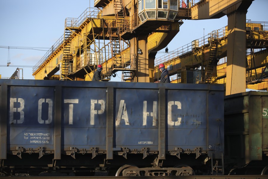 Workers work at Suifenhe Railway Port in Suifenhe, northeast China's Heilongjiang Province, Oct. 28, 2020. As of Tuesday, the 2020 import and export volume of the Suifenhe Railway Port, an important Chinese port for trade with Russia, hit 8.009 million tons, of which mineral powder imports increased by 64 percent year on year. (Photo by Zhang Tao/Xinhua)