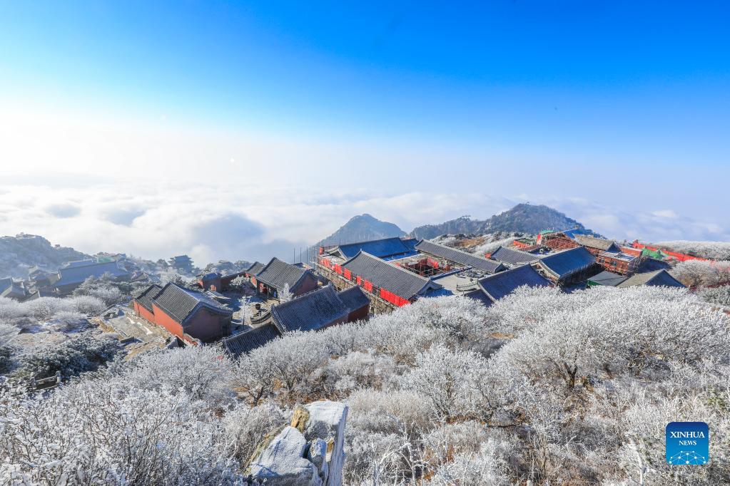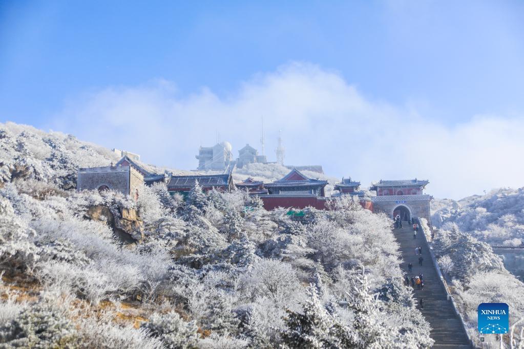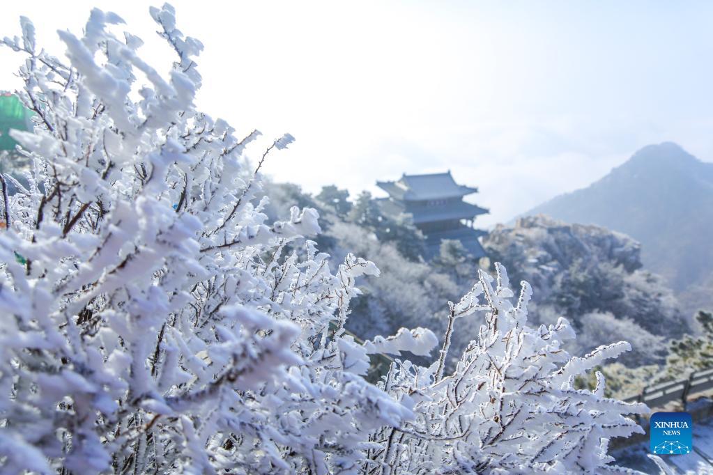 Photo shows rime-covered trees at Taishan Mountain in Tai'an, east China's Shandong Province, Dec. 14, 2021. (Photo by Cheng Xianhao/Xinhua)