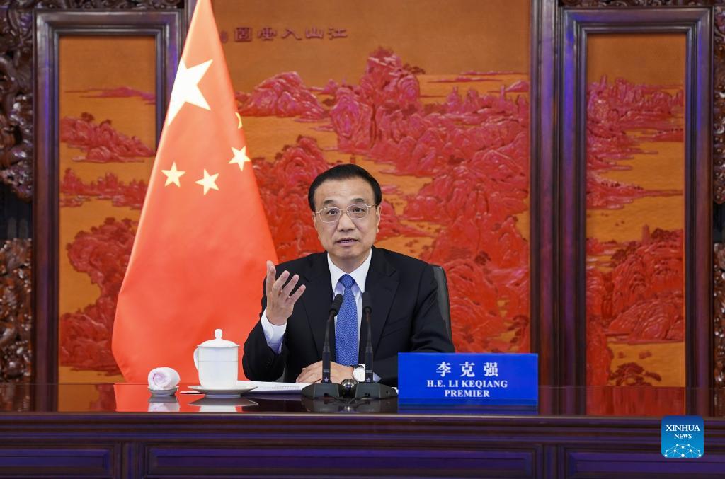 Chinese Premier Li Keqiang attends a virtual dialogue with business leaders of the Global CEO Council in Beijing, capital of China, Dec. 15, 2021. (Xinhua/Zhang Ling)