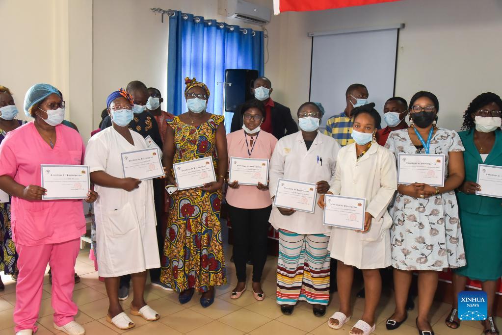 Participants with their training certificates pose for a photo at the Gynaeco-Obstetric and Paediatric Hospital in Yaounde, Cameroon, Dec. 15, 2021. The 21st batch of the China medical team in Cameroon on Wednesday organized a day-long lecture about traditional Chinese medicine (TCM) for medical personnel at the Gynaeco-Obstetric and Paediatric Hospital in the capital, Yaounde. (Xinhua/Kepseu)