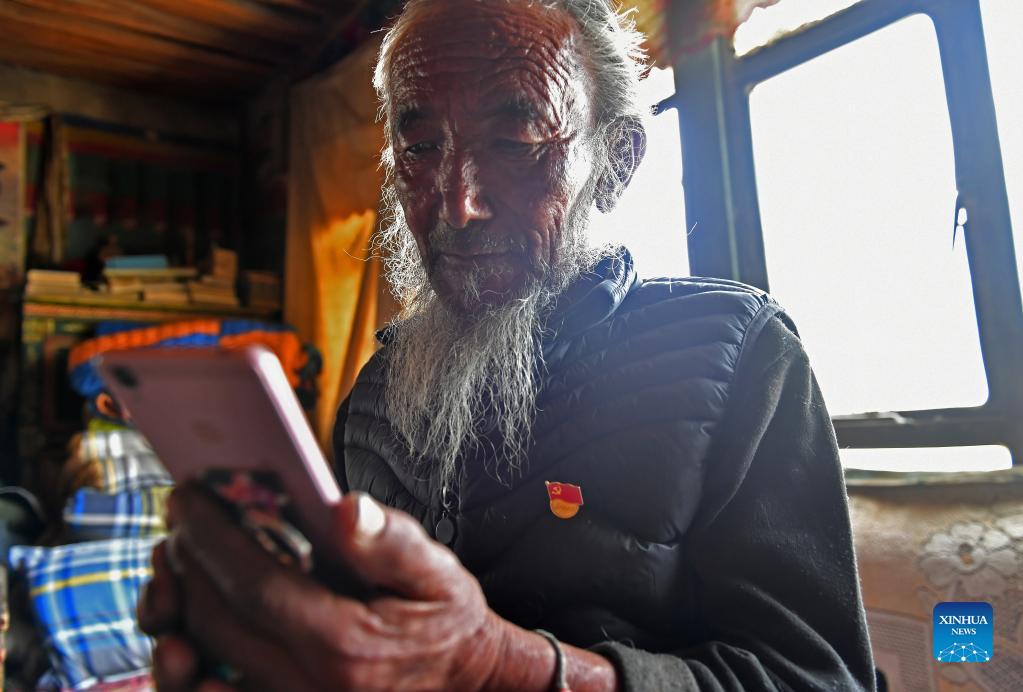 Wangyel checks information on his cellphone at home in Qumig Village of Gyangkar Township, Dinggye County, southwest China's Tibet Autonomous Region, May 12, 2021. Wangyel, born in 1951, was once a serf leading a miserable life since childhood. He and his mother depended on each other as his father died in his thirties. Together with tens of thousands of other serfs, Wangyel embraced a brand new life in 1959, when the democratic reform was launched in Tibet and feudal serfdom was abolished. His family secured land, houses and livestock. Wangyel entered elementary school, studied medicine after graduation, and became a village doctor in his hometown. Wangyel, who is kind and obliging by nature, has been getting along well with the villagers. He later started serving as the head of the village committee and the secretary of the Communist Party of China (CPC) branch of his village. As sandstorms constantly frequented the local area, Wangyel strived for funds of sand control and organized villagers to plant trees to improve the environment. Wangyel also devoted himself to helping locals lead a better life by developing collective economy. At present, the household number of the village has grown from 18 to 206, with an average annual per capita net income of more than 10,000 yuan (about 1,571 U.S. dollars). "My parents would be very gratified to see the present life if they could live till now," said Wangyel. (Xinhua/Sun Ruibo)