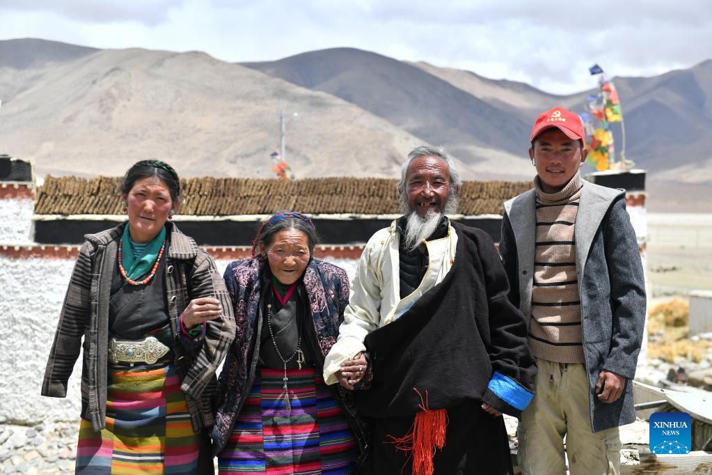 Wangyel (2nd R) poses for a photo with his family in Qumig Village of Gyangkar Township, Dinggye County, southwest China's Tibet Autonomous Region, May 12, 2021. Wangyel, born in 1951, was once a serf leading a miserable life since childhood. He and his mother depended on each other as his father died in his thirties. Together with tens of thousands of other serfs, Wangyel embraced a brand new life in 1959, when the democratic reform was launched in Tibet and feudal serfdom was abolished. His family secured land, houses and livestock. Wangyel entered elementary school, studied medicine after graduation, and became a village doctor in his hometown. Wangyel, who is kind and obliging by nature, has been getting along well with the villagers. He later started serving as the head of the village committee and the secretary of the Communist Party of China (CPC) branch of his village. As sandstorms constantly frequented the local area, Wangyel strived for funds of sand control and organized villagers to plant trees to improve the environment. Wangyel also devoted himself to helping locals lead a better life by developing collective economy. At present, the household number of the village has grown from 18 to 206, with an average annual per capita net income of more than 10,000 yuan (about 1,571 U.S. dollars). "My parents would be very gratified to see the present life if they could live till now," said Wangyel. (Xinhua/Sun Ruibo)