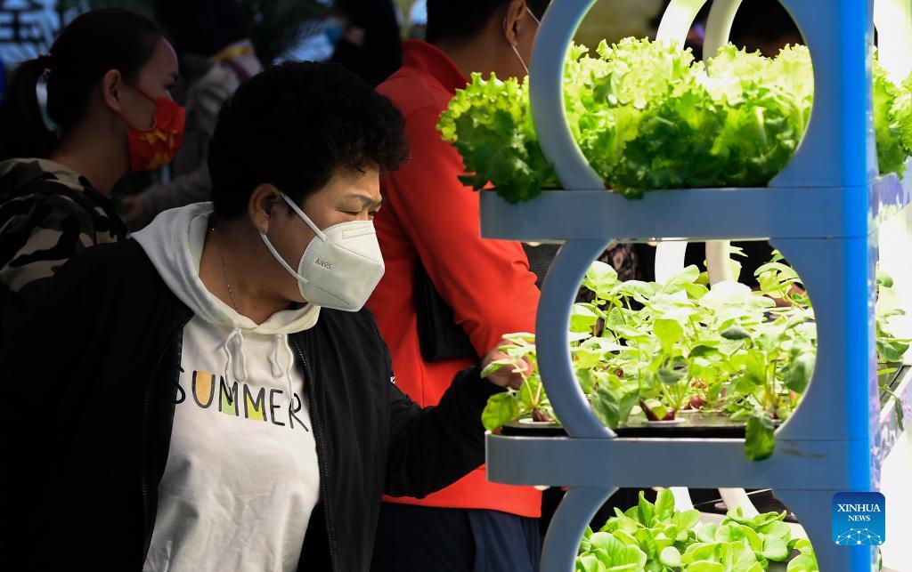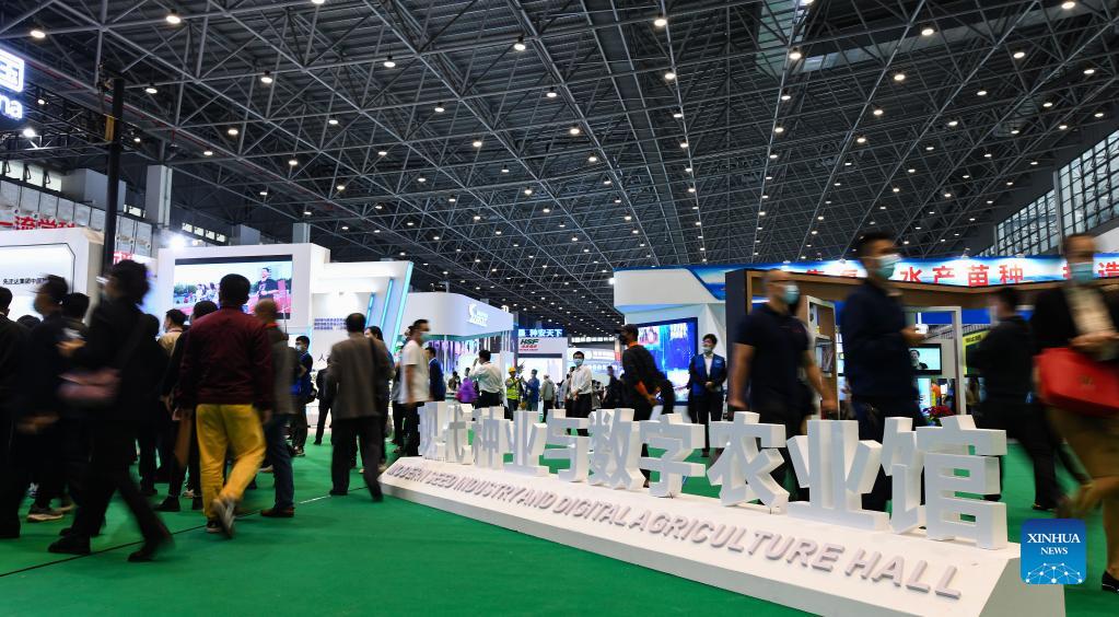 People visit the modern seed industry and digital agriculture hall of the 2021 China (Hainan) International Tropical Agricultural Products Winter Trade Fair in Haikou, south China's Hainan Province, Dec. 16, 2021. The agricultural products trade fair, with an exhibition area of about 100,000 square meters, attracted the participation of nearly 2,000 enterprises. (Xinhua/Yang Guanyu)
