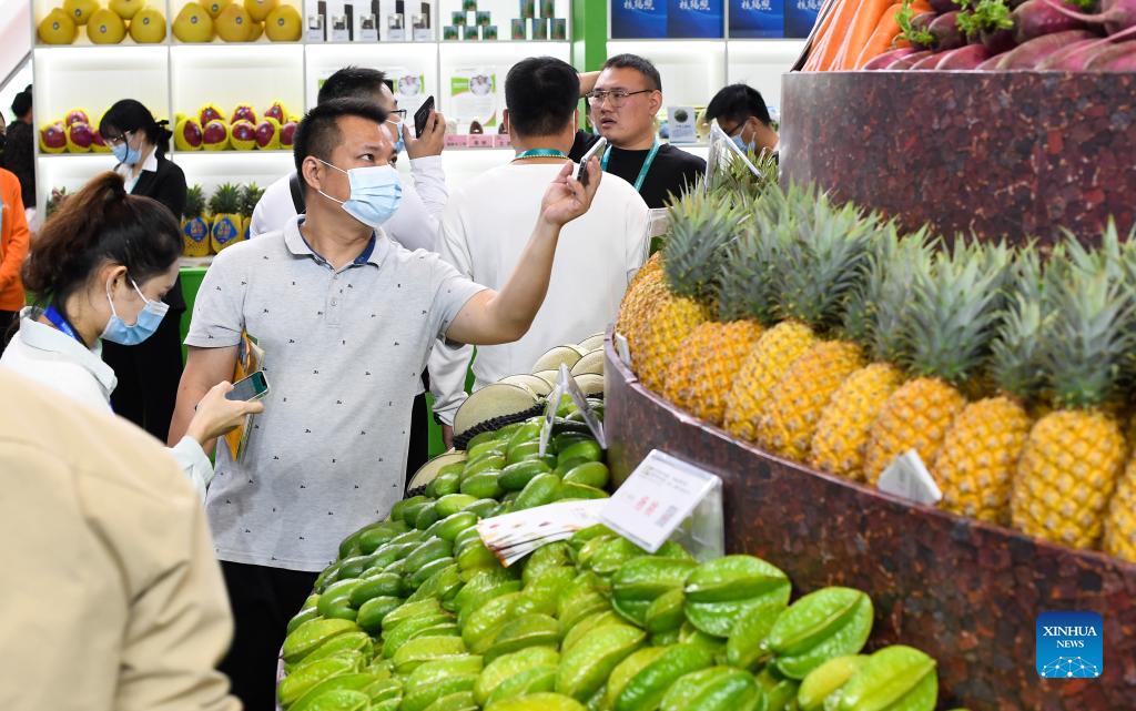 People visit the 2021 China (Hainan) International Tropical Agricultural Products Winter Trade Fair in Haikou, south China's Hainan Province, Dec. 16, 2021. The agricultural products trade fair, with an exhibition area of about 100,000 square meters, attracted the participation of nearly 2,000 enterprises. (Xinhua/Luo Jiang)