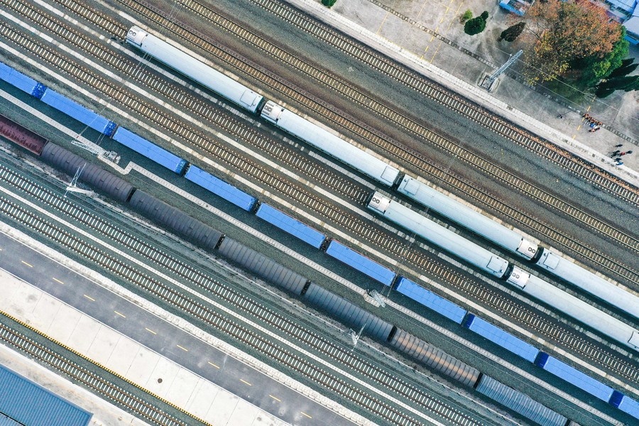 Aerial photo taken on Nov. 18, 2021 shows the first direct China-Europe freight train (blue) linking southwest China's Guizhou Province and Russia's Moscow pulling up in Guiyang, southwest China's Guizhou Province. (Xinhua/Yang Wenbin)