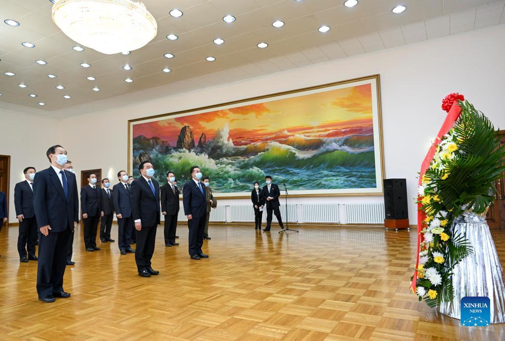 Wang Chen, a member of the Political Bureau of the Communist Party of China (CPC) Central Committee and vice chairman of the National People's Congress Standing Committee, attends a commemorative activity marking the 10th anniversary of the passing of Kim Jong Il, former supreme leader of the Democratic People's Republic of Korea (DPRK), and presents a flower basket in the name of the CPC Central Committee at the DPRK embassy in Beijing, capital of China, Dec. 16, 2021. (Xinhua/Yin Bogu)