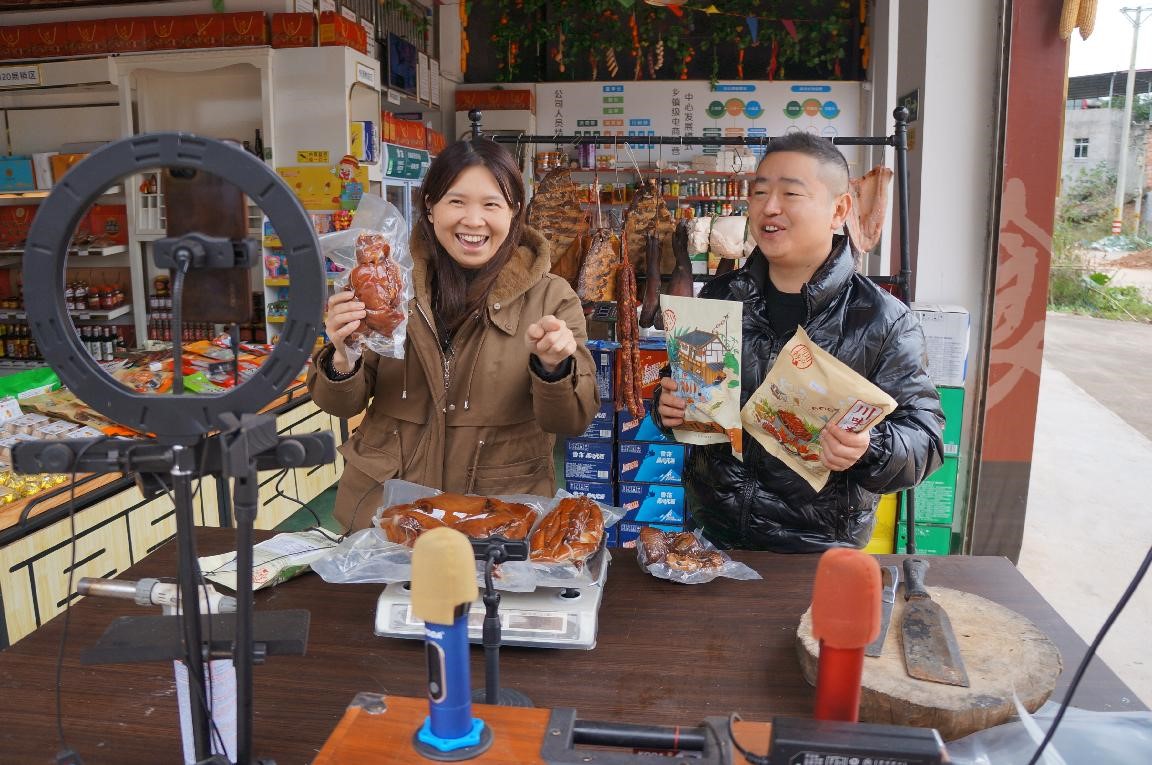 Owners of a grocery shop in Shuangsheng township, Yilong county, Nanchong, southwest China's Sichuan province sell their products on a livestream show, Nov. 7, 2021. (People's Daily/Tang Mingping)