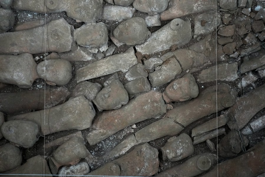 Photo taken on Dec. 16, 2021 shows ancient pottery horses unearthed from the large-scale mausoleum located in Jiangcun Village on the eastern outskirts of Xi'an, northwest China's Shaanxi Province. (Xinhua/Zhang Bowen)