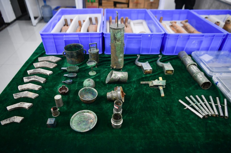 Photo taken on Dec. 16, 2021 shows cultural relics unearthed from the large-scale mausoleum and the mausoleum of Empress Dowager Bo, mother of Emperor Wendi of the Western Han Dynasty (202 BC-AD 25), in northwest China's Shaanxi Province. (Xinhua/Zhang Bowen)