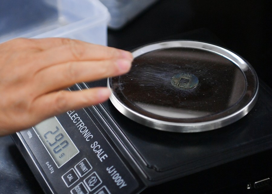 A staff member weighs a copper unearthed from the large-scale mausoleum located in Jiangcun Village on the eastern outskirts of Xi'an, northwest China's Shaanxi Province, Dec. 16, 2021. (Xinhua/Zhang Bowen)