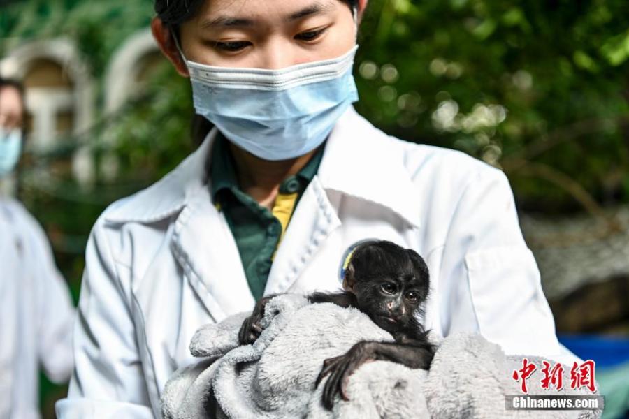 Photo shows a staff holding black bearded saki cub Congcong on December 16, 2021 in Guangzhou, south China's Guangdong Province. Congcong, a male black bearded saki cub born on July 22, 2021, meets public at Chimelong Safari Park in Guangzhou, capital of south China's Guangdong Province, Dec. 16, 2021. (Photo/China News Service)