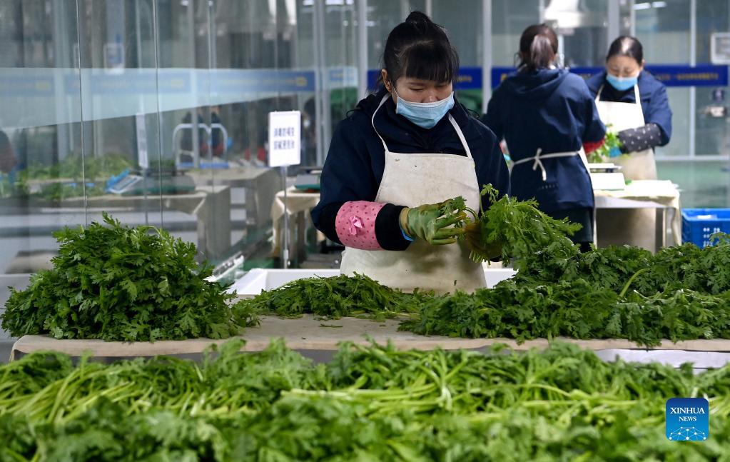 Staff members sort out vegetable at a logistics center in Xi'an, northwest China's Shaanxi Province, Dec. 19, 2021. Xi'an authorities have been making continuous efforts to ensure the supply of vegetables amid the ongoing COVID-19 pandemic. (Xinhua/Liu Xiao)