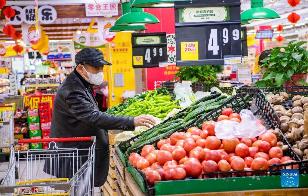A resident purchases vegetable at a supermarket in Xi'an, northwest China's Shaanxi Province, Dec. 19, 2021. Xi'an authorities have been making continuous efforts to ensure the supply of vegetables amid the ongoing COVID-19 pandemic. (Photo by Yuan Jingzhi/Xinhua)