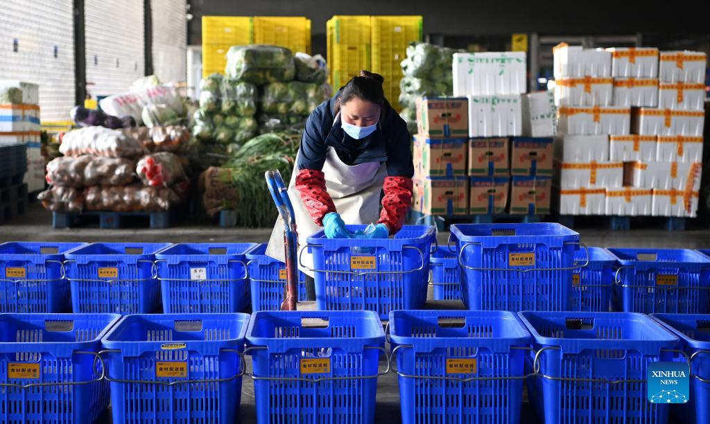 A staff member packs vegetable at a logistics center in Xi'an, northwest China's Shaanxi Province, Dec. 19, 2021. Xi'an authorities have been making continuous efforts to ensure the supply of vegetables amid the ongoing COVID-19 pandemic. (Xinhua/Liu Xiao)
