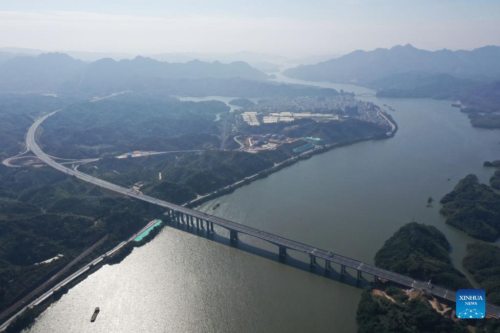 Aerial photo taken on Dec. 19, 2021 shows the Beijiang grand bridge in Yingde City of Qingyuan, south China's Guangdong Province. The Guangzhou-Lianzhou Expressway starts from Huadu District of Guangzhou and ends in Lianzhou City of Qingyuan, connecting with Yueyang-Linwu Expressway of Hunan. The main project will be opened to traffic by the end of 2021. After completion, it will further improve the inter-provincial corridor between Guangdong and Hunan and promote the integration of mountainous areas in northern Guangdong into the Guangdong-Hong Kong-Macao Greater Bay Area. (Xinhua/Liu Dawei)
