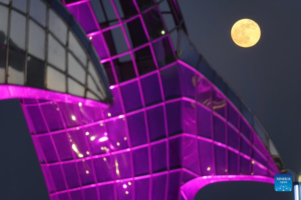 Photo taken on Dec. 19, 2021 shows the full moon in Yantai City, east China's Shandong Province. The last full moon in the year of 2021 appeared on Sunday, the sixteenth day on the eleventh month of the Chinese lunar calendar. (Photo by Tang Ke/Xinhua)