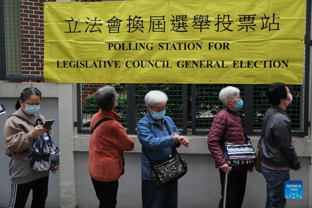 Voters wait to cast ballot at a polling station in Wan Chai of Hong Kong, south China, Dec. 19, 2021. The election for the seventh-term Legislative Council (LegCo) of the Hong Kong Special Administrative Region (HKSAR) kicked off Sunday morning, the first since the improvement to the HKSAR electoral system. More than 600 polling stations opened at 8:30 a.m. local time (0030 GMT) across Hong Kong for about 4.5 million registered electors to cast their votes. (Xinhua/Wu Xiaochu)