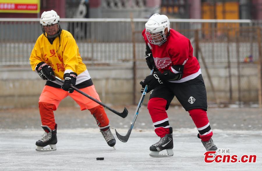 A team of hockey players competes at a park in Shenyang, northeast China's Liaoning Province, Dec. 20, 2021. (Photo: China News Service/Yu Haiyang)