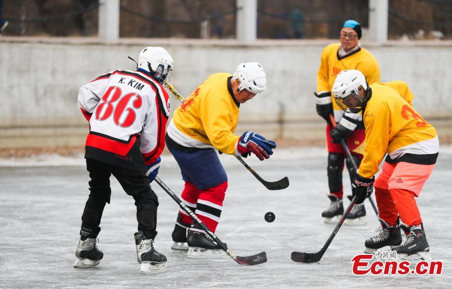 A team of hockey players competes at a park in Shenyang, northeast China's Liaoning Province, Dec. 20, 2021. (Photo: China News Service/Yu Haiyang)