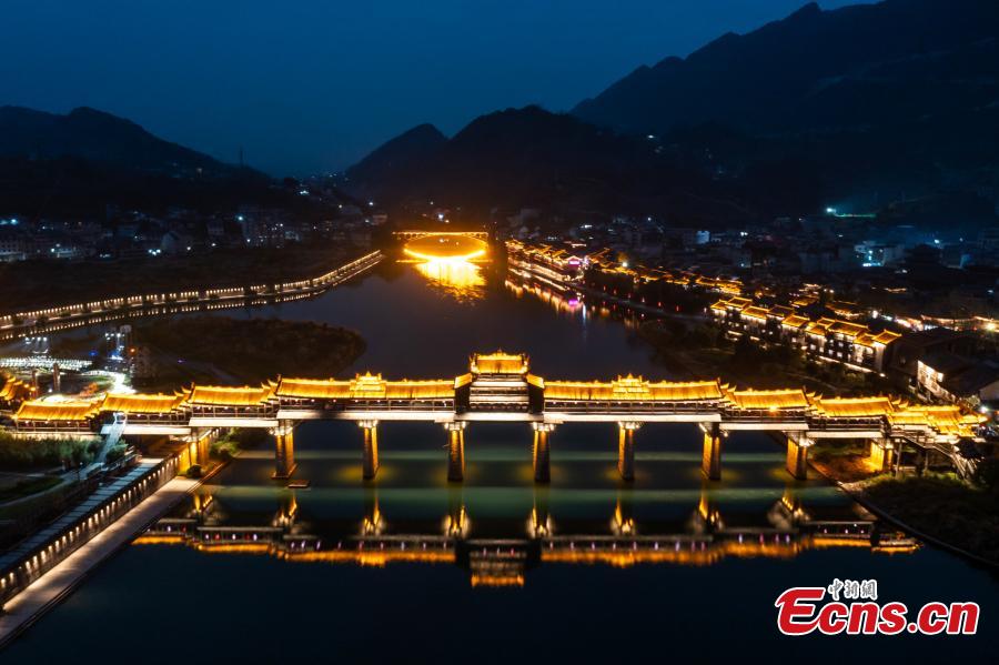 Photo taken on Dec.19, 2021 shows the bright lights of Zhuoshui Fengyu, known as Asia's longest covered bridge, in Qianjiang District, southwest China's Chongqing Municipality. (Photo: China News Service/He Penglei)