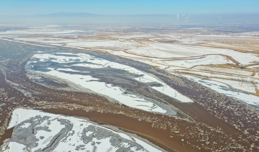 Aerial photo taken on Dec. 13, 2021 shows flowing ice on the Yellow River in Ordos, north China's Inner Mongolia Autonomous Region. (Xinhua/Lian Zhen)
