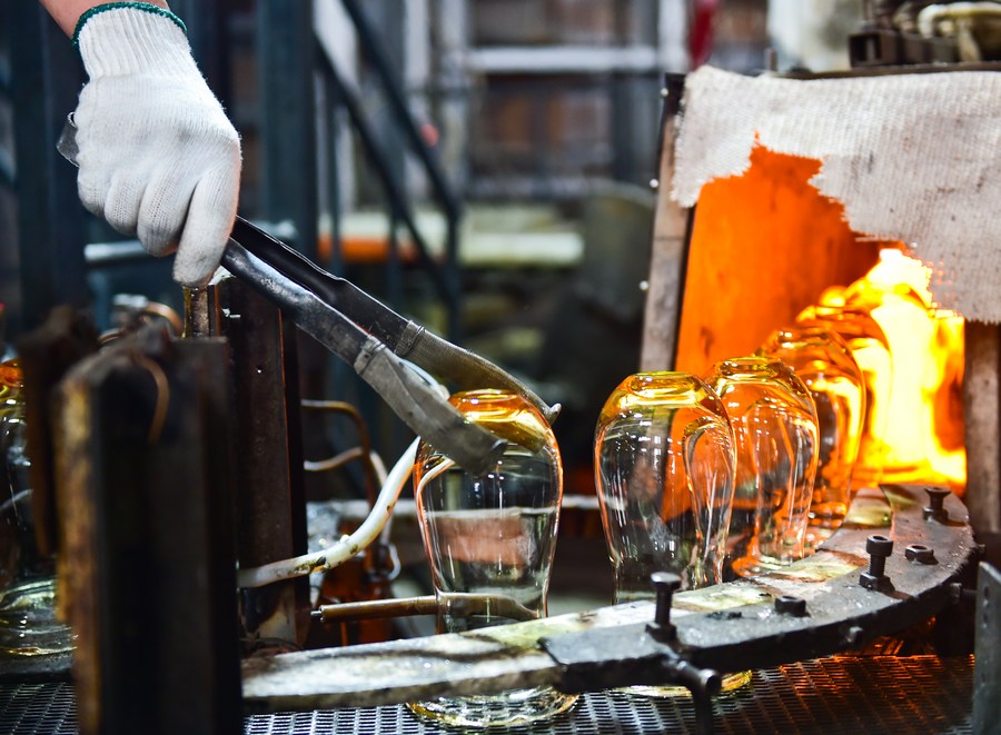 A worker makes glassware in Qixian County, north China's Shanxi Province, May 26, 2021. Glassware made in Qixian County has been exported to over 80 countries and regions. (Xinhua/Chai Ting)