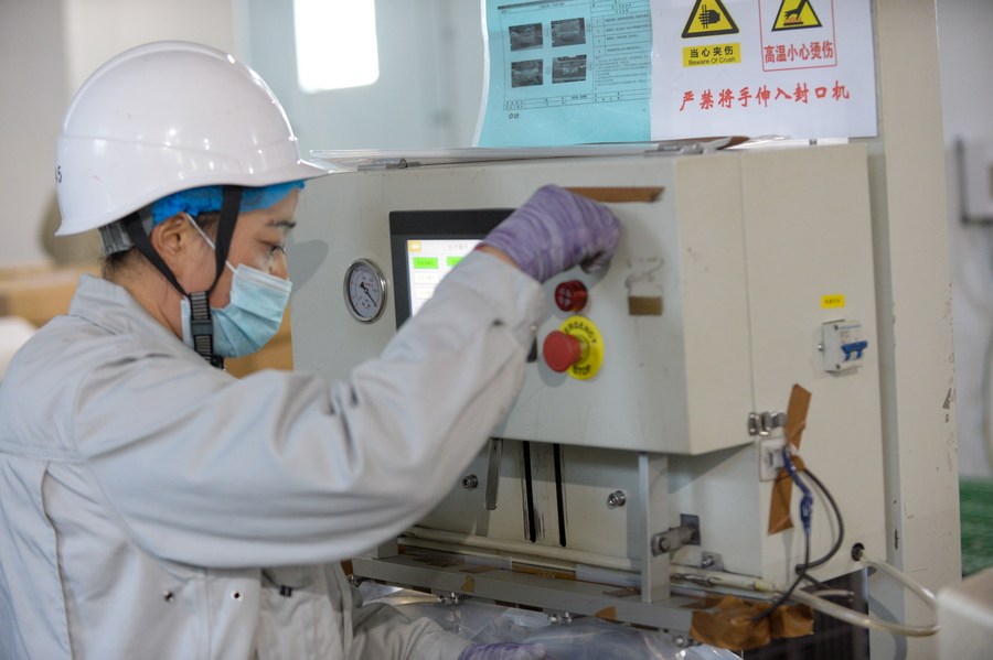 An employee operates a machine at the production workshop of a polysilicon company in northwest China's Xinjiang Uygur Autonomous Region, Dec. 16, 2021. (Xinhua/Gao Han)