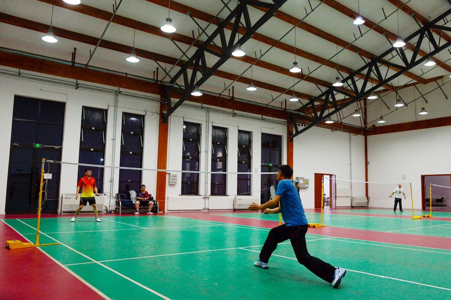 Employees play badminton after work at a polysilicon company in northwest China's Xinjiang Uygur Autonomous Region, Dec. 15, 2021. (Xinhua/Gao Han)