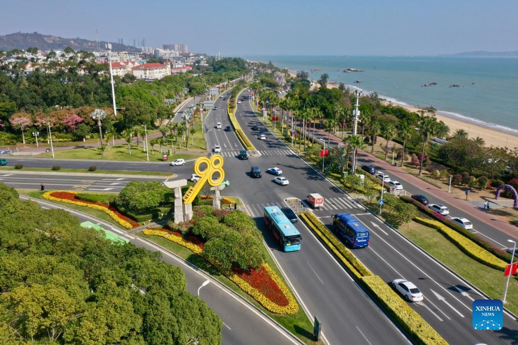 Aerial photo taken on Dec. 12, 2021 shows people enjoying their leisure time on the beach in Xiamen, southeast China's Fujian Province. This year marks the 40th anniversary of the establishment of the Xiamen Special Economic Zone (SEZ). The Xiamen SEZ has made important contributions to the country's reform, opening up, and socialist modernization, and played a unique role in promoting national reunification. (Xinhua/Jiang Kehong)