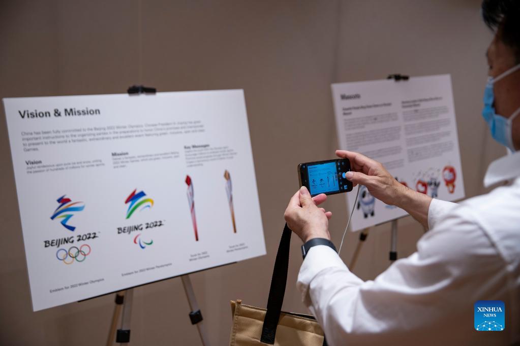 A guest takes pictures at the Beijing 2022 &Winter Travel around China Photography Exhibition at China Cultural Centre in Sydney, Australia, Dec. 21, 2021. (Xinhua/Bai Xuefei)