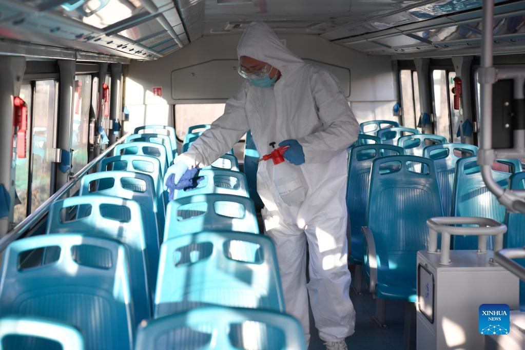 A staff member disinfects a bus in Xi'an, northwest China's Shaanxi Province, Dec. 21, 2021. (Xinhua/Shao Rui)