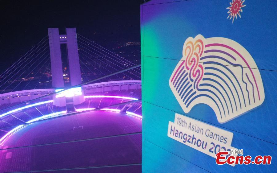 The logo of the 19th Asian Games Hangzhou 2022 is displayed at the Huanglong Sports Centre Stadium in Hangzhou, east China's Zhejiang Province, Dec. 20, 2021. (Photo: China News Service/Wang Gang)