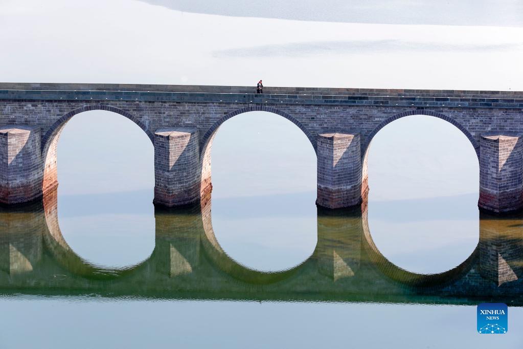 Photo shows the repaired Zhenhai Bridge in Tunxi District of Huangshan, east China's Anhui Province, Dec. 21, 2021. An ancient bridge destroyed by floods in east China's Anhui Province will reopen soon after repair, local authorities said. The repair work, which started on Nov. 13, 2020, has been completed and passed quality inspection on Tuesday. The Zhenhai Bridge, built during the Ming Dynasty (1368-1644), was a state-level cultural relics protection site in the city of Huangshan. Floodwaters destroyed the 131-meter-long bridge during a heavy rainstorm on July 7, 2020. (Photo by Shi Yalei/Xinhua)