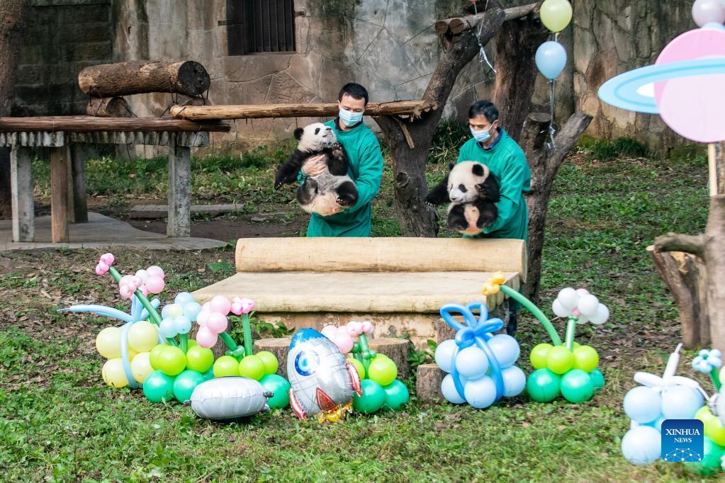 The giant panda twins "Xingxing" and "Chenchen" are seen at Chongqing Zoo in southwest China's Chongqing Municipality, Dec. 21, 2021. Chongqing Zoo held a naming ceremony for giant panda twins "Qizhen" and "Qibao", as well as "Xingxing" and "Chenchen" on Wednesday. Brother and sister panda twins "Qizhen" and "Qibao" were born in the zoo on Sept. 13, whose names together mean "precious babies." The other pair of panda twins, born on June 10, were named "Xingxing" and "Chenchen". (Xinhua/Tang Yi)