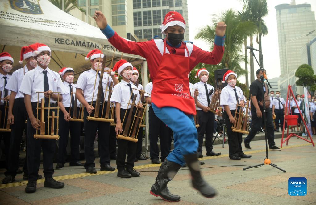 Students wearing masks participate in a Christmas carol service at the roadside in Jakarta, Indonesia, Dec. 21, 2021. (Xinhua/Zulkarnain)