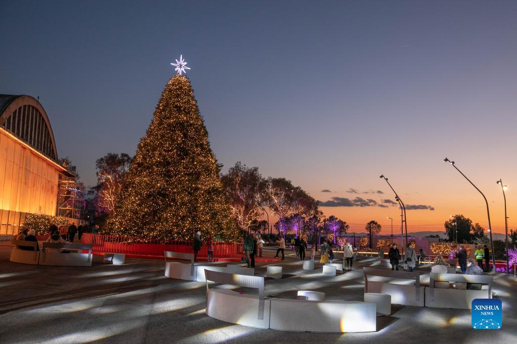 Photo taken on Dec. 20, 2021 shows a Christmas tree in the Experience Park in Elliniko in Athens, Greece. The Experience Park opened to the public on Monday with decorations for the festive season. (Photo by Lefteris Partsalis/Xinhua)