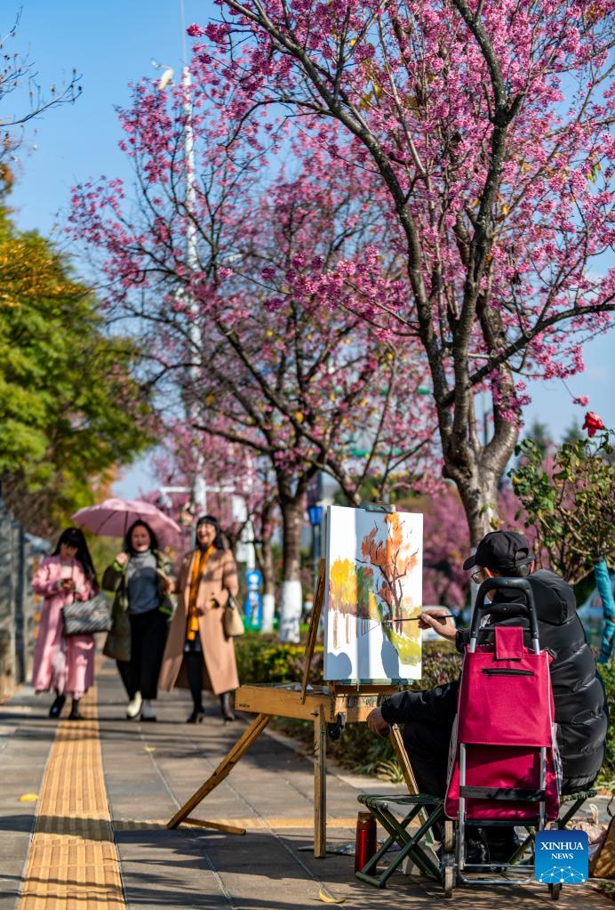 Photo taken on Dec. 21, 2021 shows people enjoying cherry blossoms in winter in Kunming City, southwest China's Yunnan Province. (Xinhua/Chen Xinbo)