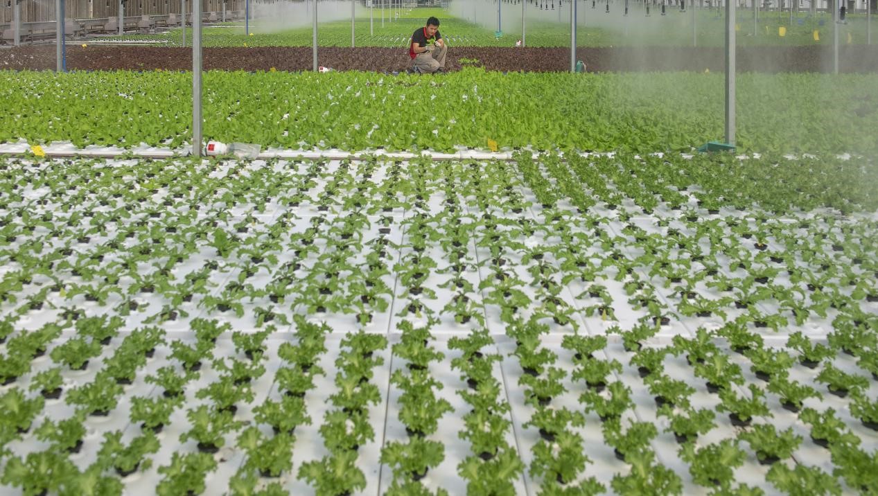 A worker checks the growth of vegetables at a smart planting factory in Chini township, Huadu district, Guangzhou city, south China’s Guangdong province, Dec. 11, 2021. (People’s Daily Online/Qiu Xinsheng)