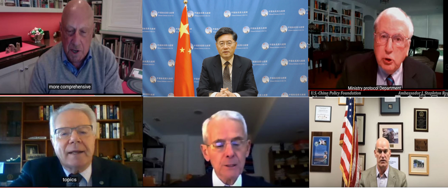 Chinese Ambassador to the United States Qin Gang (Middle, Top Row) attends the annual gala of the U.S.-China Policy Foundation held virtually on Dec. 21, 2021. (Courtesy of Chinese Embassy in the United States)