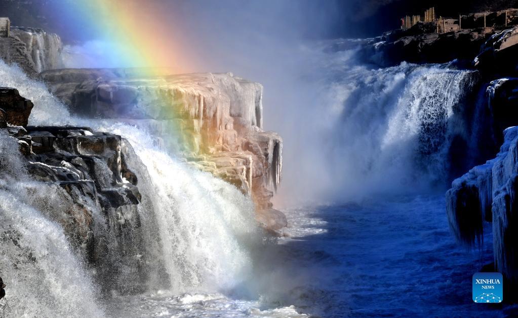 Photo taken on Dec. 21, 2021 shows a rainbow and the scenery of the Hukou Waterfall on the Yellow River in northwest China's Shaanxi Province. The Hukou Waterfall, located on the border area between north China's Shanxi and northwest China's Shaanxi provinces, formed spectacular winter scenery as temperature continued to drop in recent days. (Xinhua/Tao Ming)