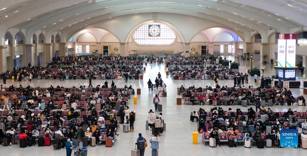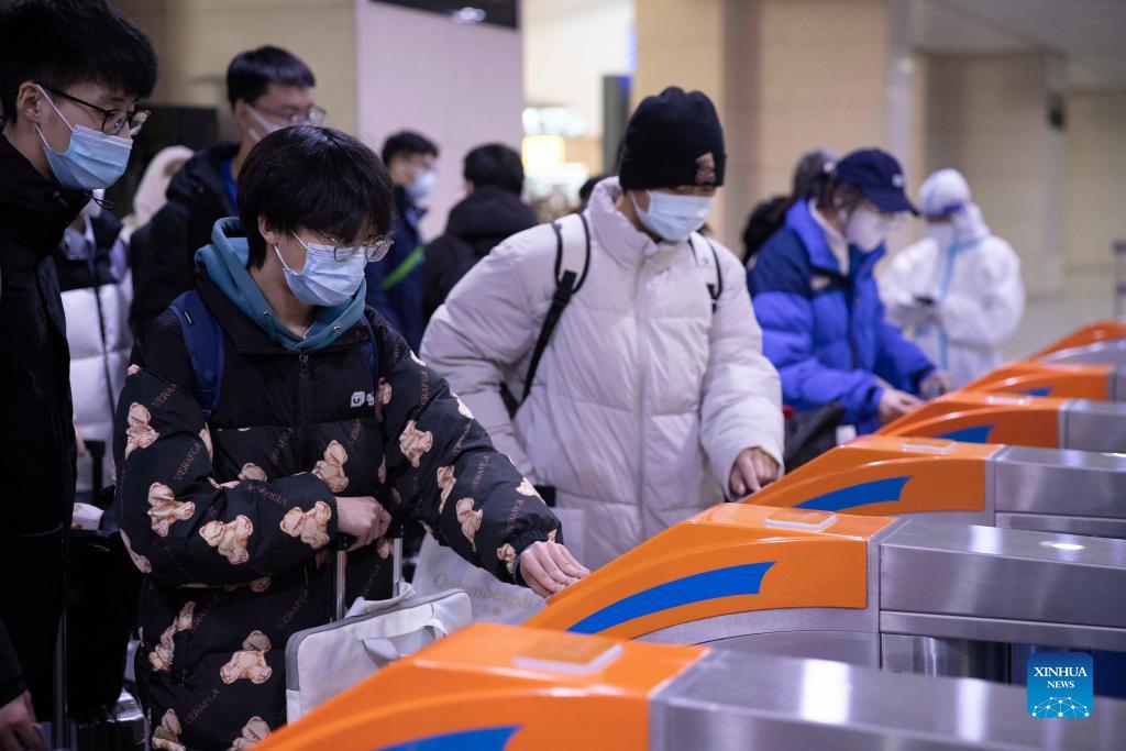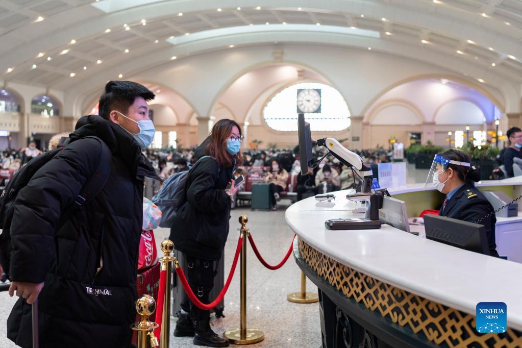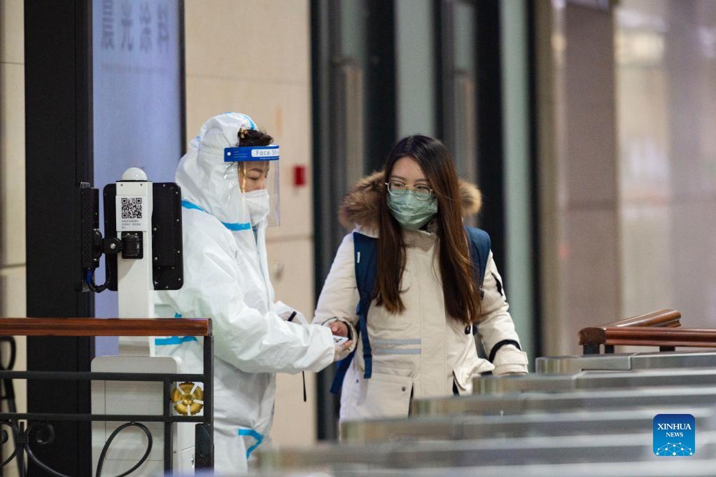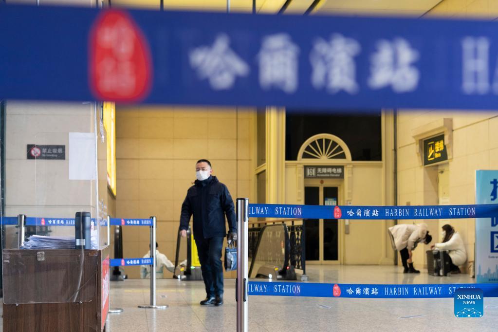 Citizens are seen at the Harbin Railway Station in Harbin, northeast China's Heilongjiang Province, Dec. 22, 2021. The whole city of Harbin downgraded to the low-risk category for COVID-19 on Wednesday. (Xinhua/Xie Jianfei)