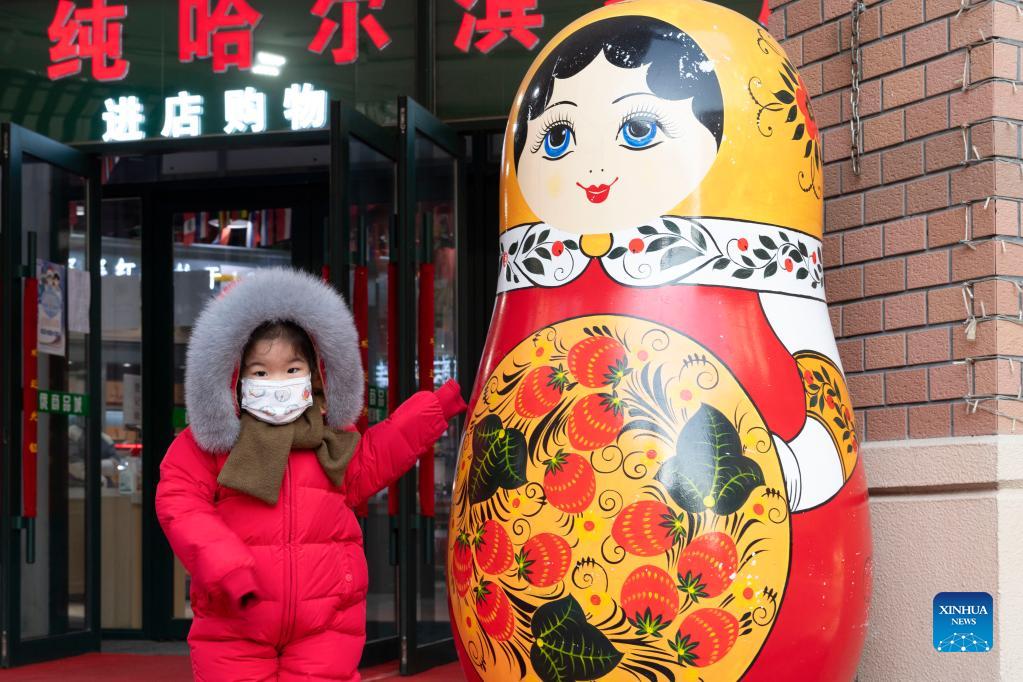 A child is seen at the Central Street in Harbin, northeast China's Heilongjiang Province, Dec. 22, 2021. The whole city of Harbin downgraded to the low-risk category for COVID-19 on Wednesday. (Xinhua/Xie Jianfei)
