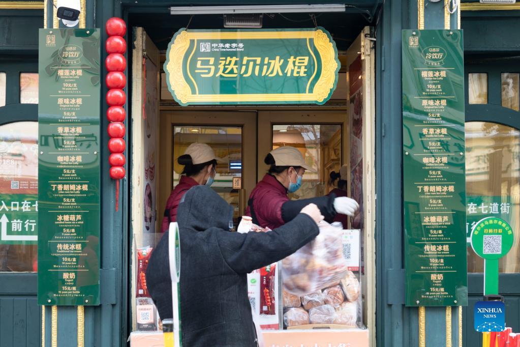 A citizen buys food at the Central Street in Harbin, northeast China's Heilongjiang Province, Dec. 22, 2021. The whole city of Harbin downgraded to the low-risk category for COVID-19 on Wednesday. (Xinhua/Xie Jianfei)