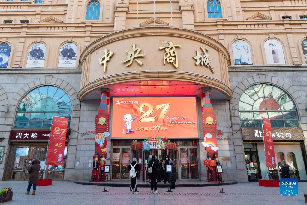 Citizens enter a shopping mall at the Central Street in Harbin, northeast China's Heilongjiang Province, Dec. 22, 2021. The whole city of Harbin downgraded to the low-risk category for COVID-19 on Wednesday. (Xinhua/Xie Jianfei)