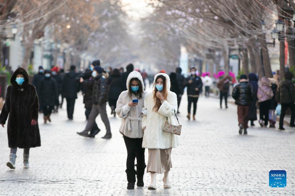 Citizens walk at the Central Street in Harbin, northeast China's Heilongjiang Province, Dec. 22, 2021. The whole city of Harbin downgraded to the low-risk category for COVID-19 on Wednesday. (Xinhua/Zhang Tao)