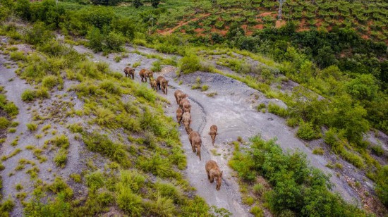 Aerial photo taken on Aug. 9, 2021, shows a herd of wild Asian elephants in Yuanjiang county of Yuxi city, southwest China’s Yunnan Province. (Xinhua/Hu Chao)