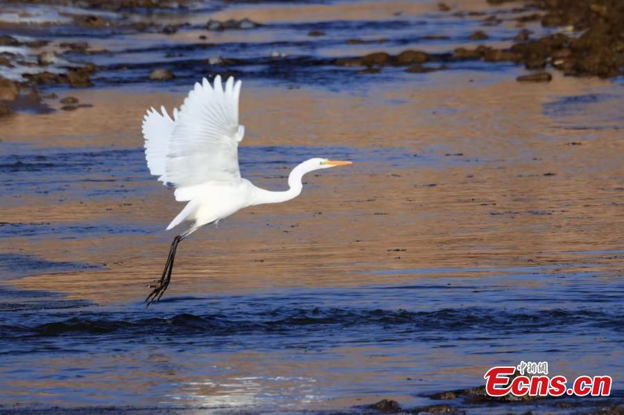 Photo shows a great white heron in Zhangxian County, Dingxi City, northwest China's Gansu Province. (Photo: China News Service/Ma Tianyun)