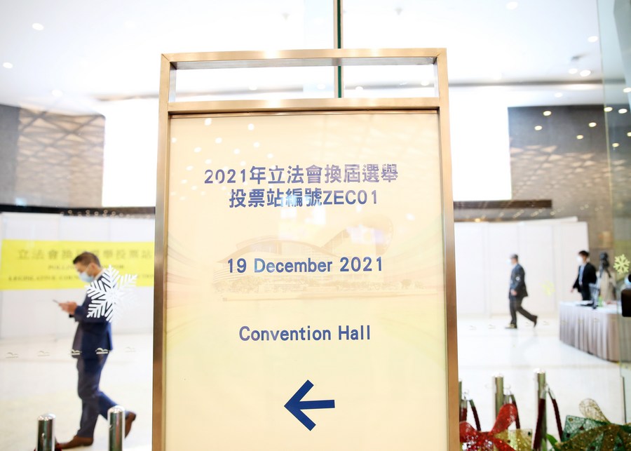 Staff members are seen at the polling station of the Hong Kong Convention and Exhibition Center in Hong Kong, south China, Dec. 19, 2021. (Xinhua/Li Gang)