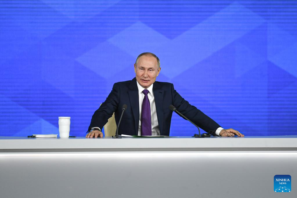 Russian President Vladimir Putin speaks at his annual press conference in Moscow, Russia, Dec. 23, 2021. (Xinhua/Evgeny Sinitsyn)