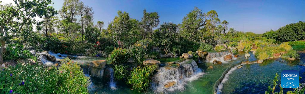 Panoramic photo taken by cell photo shows the water outlet of Guangzhou Lijiao sewage treatment plant in Guangzhou, south China's Guangdong Province, Nov. 24, 2021. Traditional sewage treatment plants are being transformed into ecological underground sewage treatment plants in Guangzhou, to improve land utilization and tackle problems of secondary pollution.